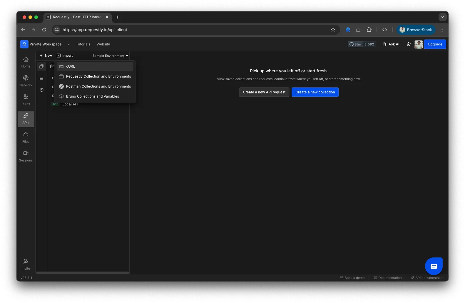 Download and launch Requestly (available as a web app or desktop app). Navigate to the API section from the dashboard.