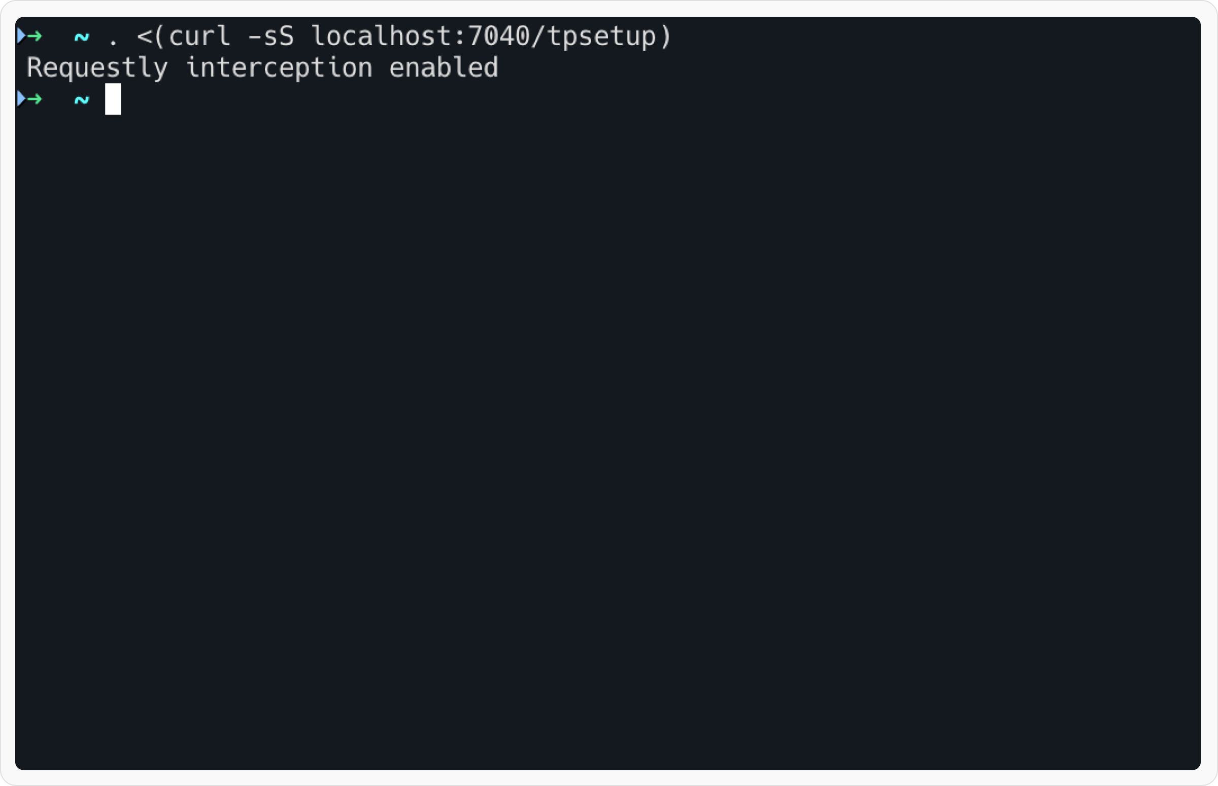Open the terminal where you will start your Node.js server and paste the copied command. Press Enter to execute it.If the command runs successfully, you should see a confirmation message in your terminal indicating that Requestly interception is enabled.