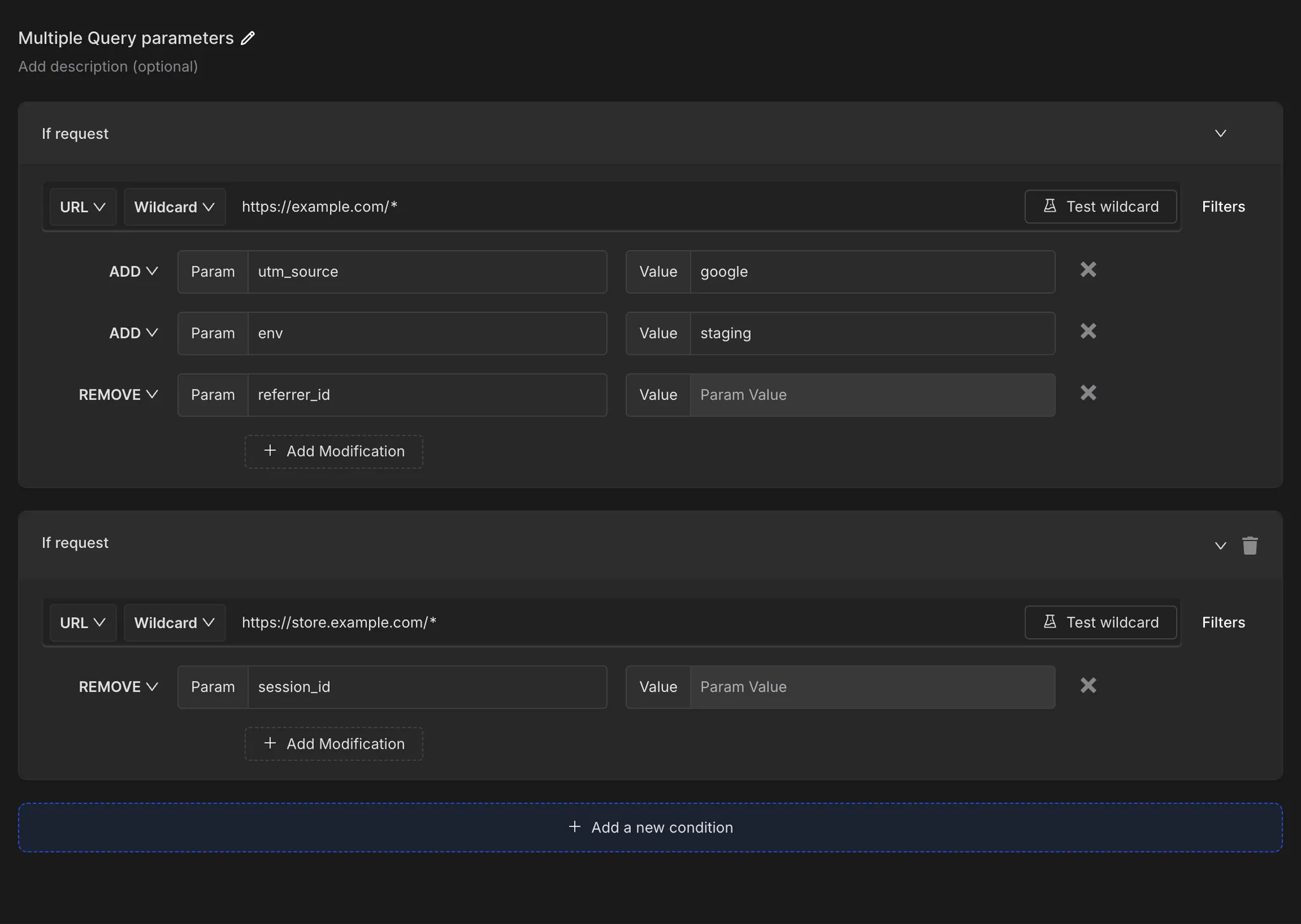 The Query Param Rule in Requestly allows users to define multiple conditions within a single rule to modify query parameters in different URLs. Instead of manually appending, updating, or removing query parameters in multiple rules, you can consolidate all changes into one rule .