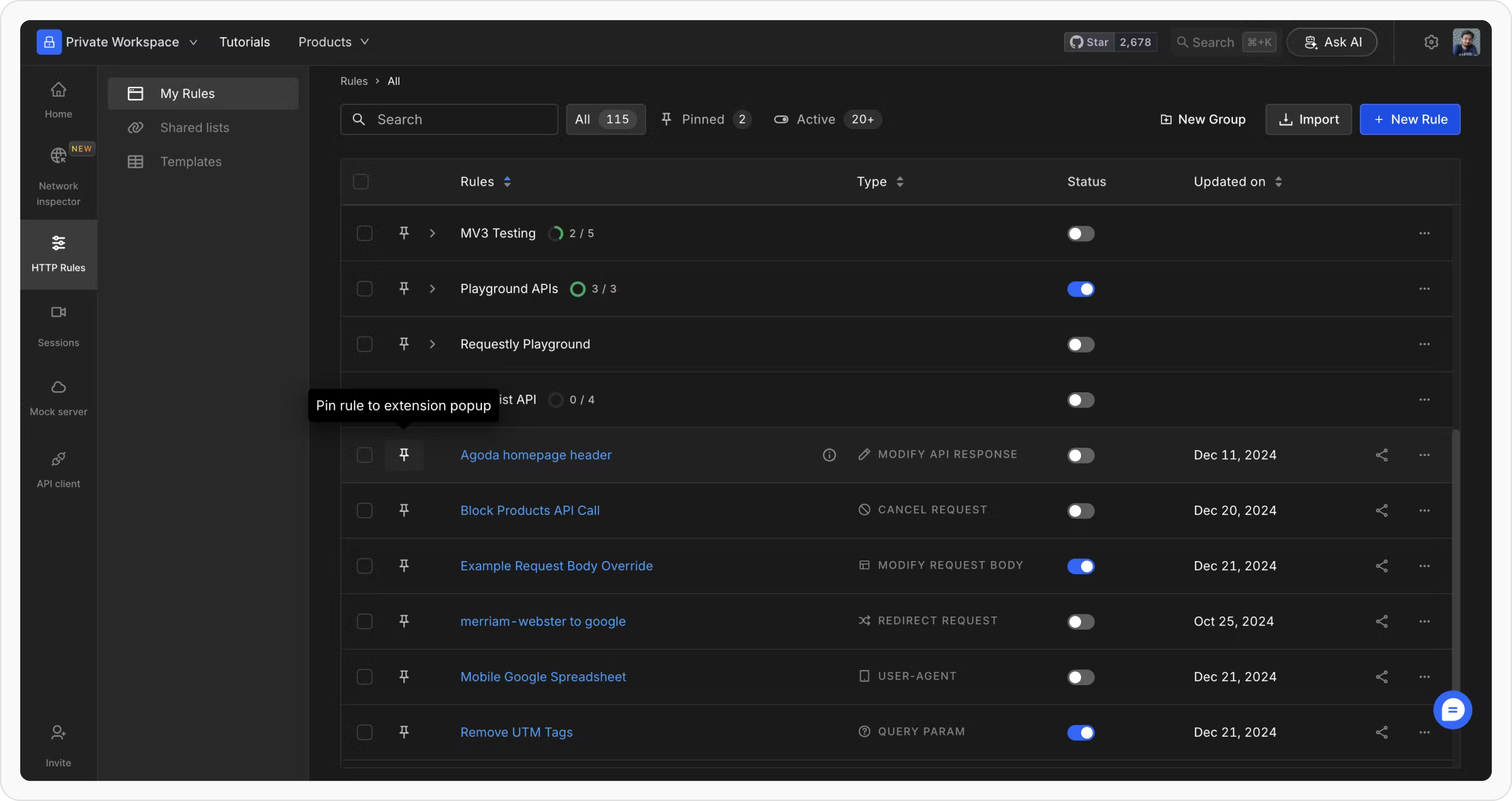 Pinning rules in Requestly allows you to quickly access and manage your rules directly from the Chrome toolbar, streamlining your workflow without the need to open the Requestly app. This feature is particularly useful for toggling rules on or off with ease.