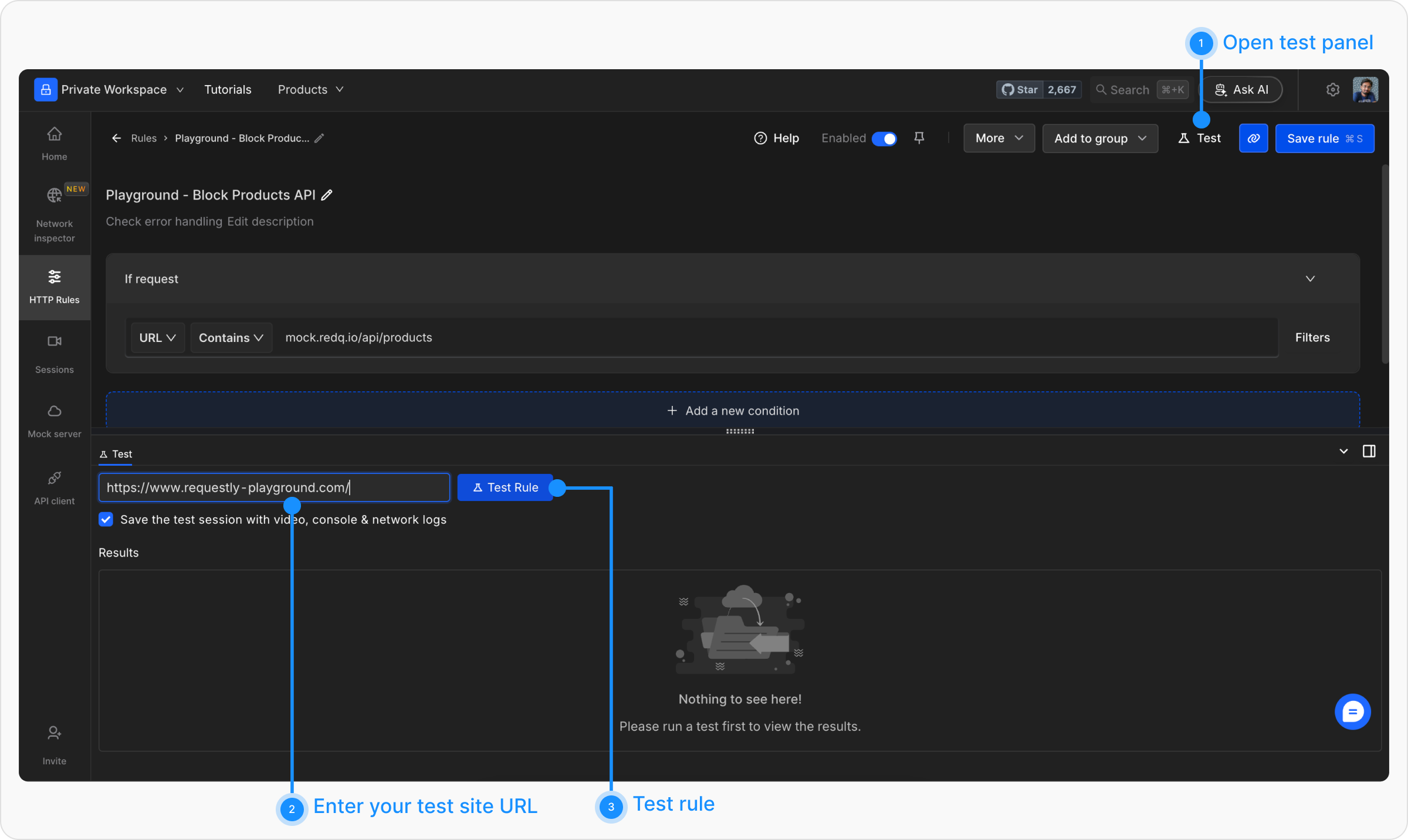 Test button and enter the URL of the page where the matching URL is called. This will open the webpage in a new tab, with a widget showing the status of applied rules.On loading the https://www.requestly-playground.com/ website, it shows network error. A small widget on the page confirms that the Rule is applied. You can click on View Results button to view the result details.