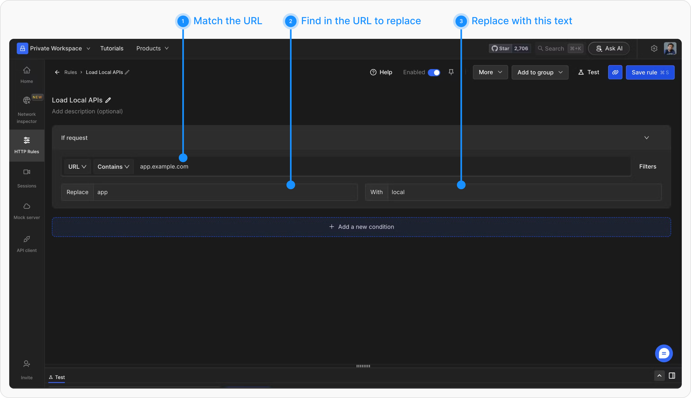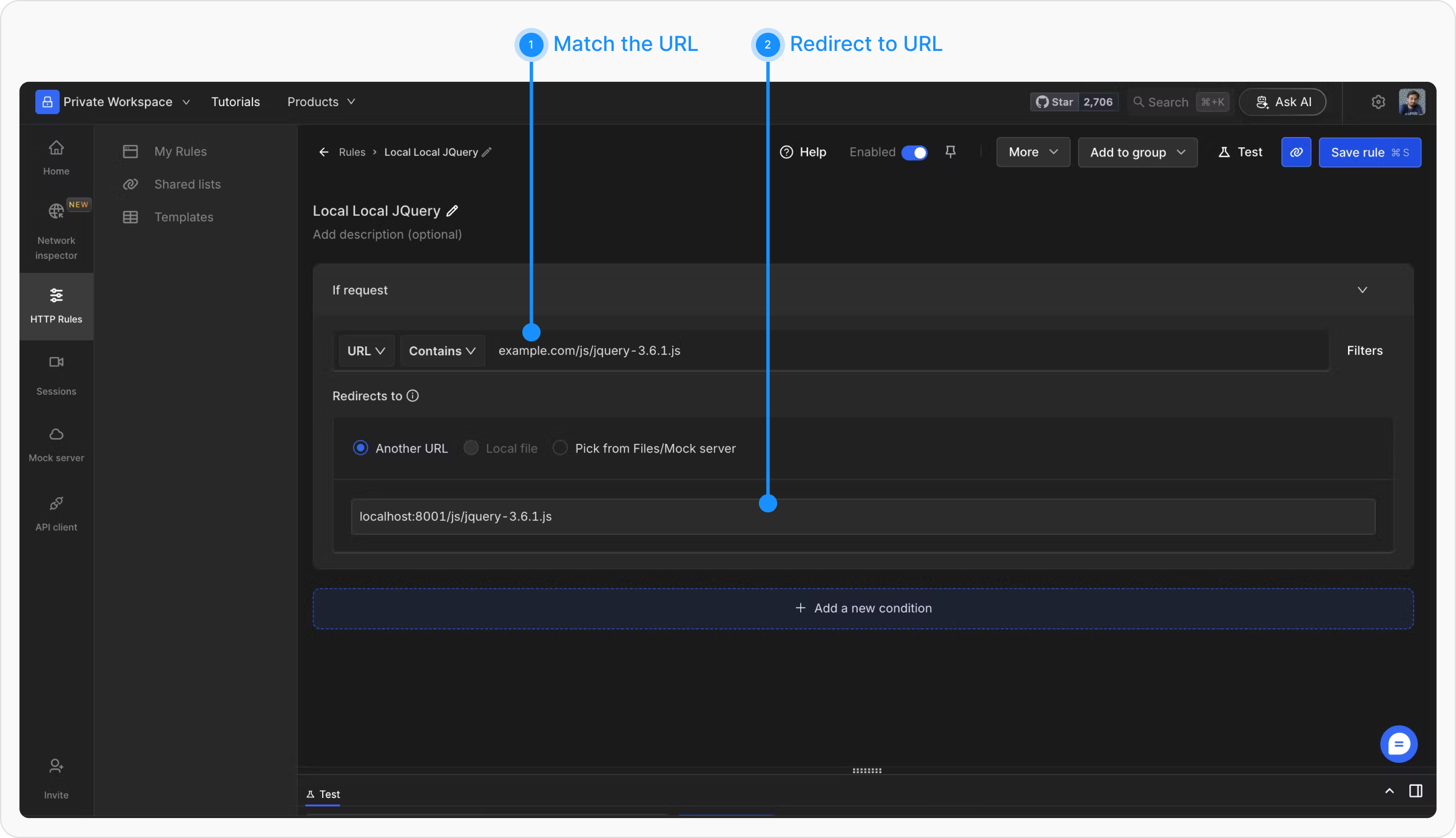 The Redirect rule enables you to specify a complete URL to which a network request should be redirected. This is particularly helpful for direct mappings of entire endpoints or domains.→ Learn how to create a Redirect Request rule.
