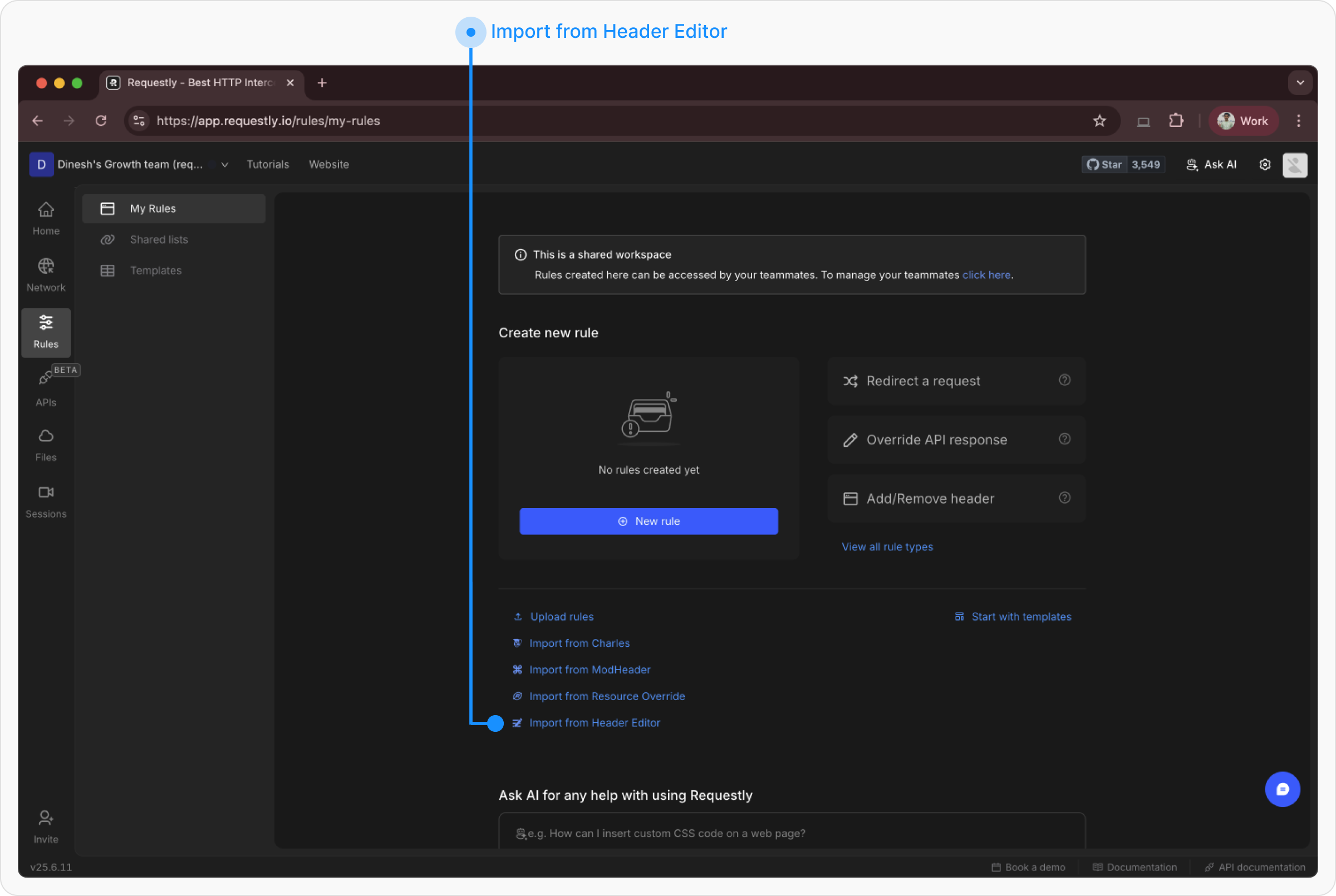 If you don’t have any existing rules, you’ll see an Import from Header Editor option directly on the screen. Click it to open the import popup.