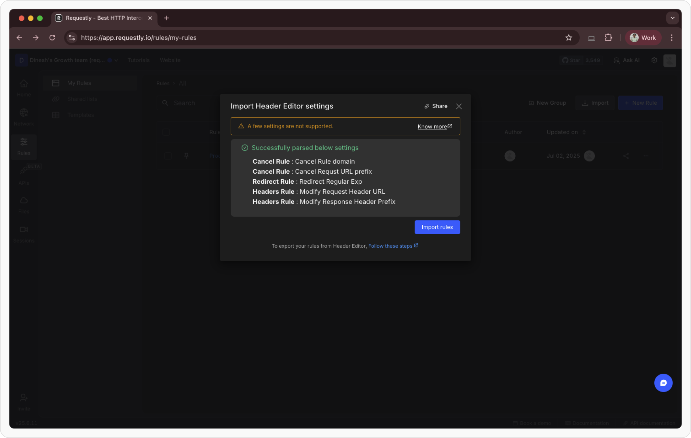 Once the file is processed successfully, your Header Editor configurations will be automatically converted into Requestly rules. Review and confirm them in your dashboard.
