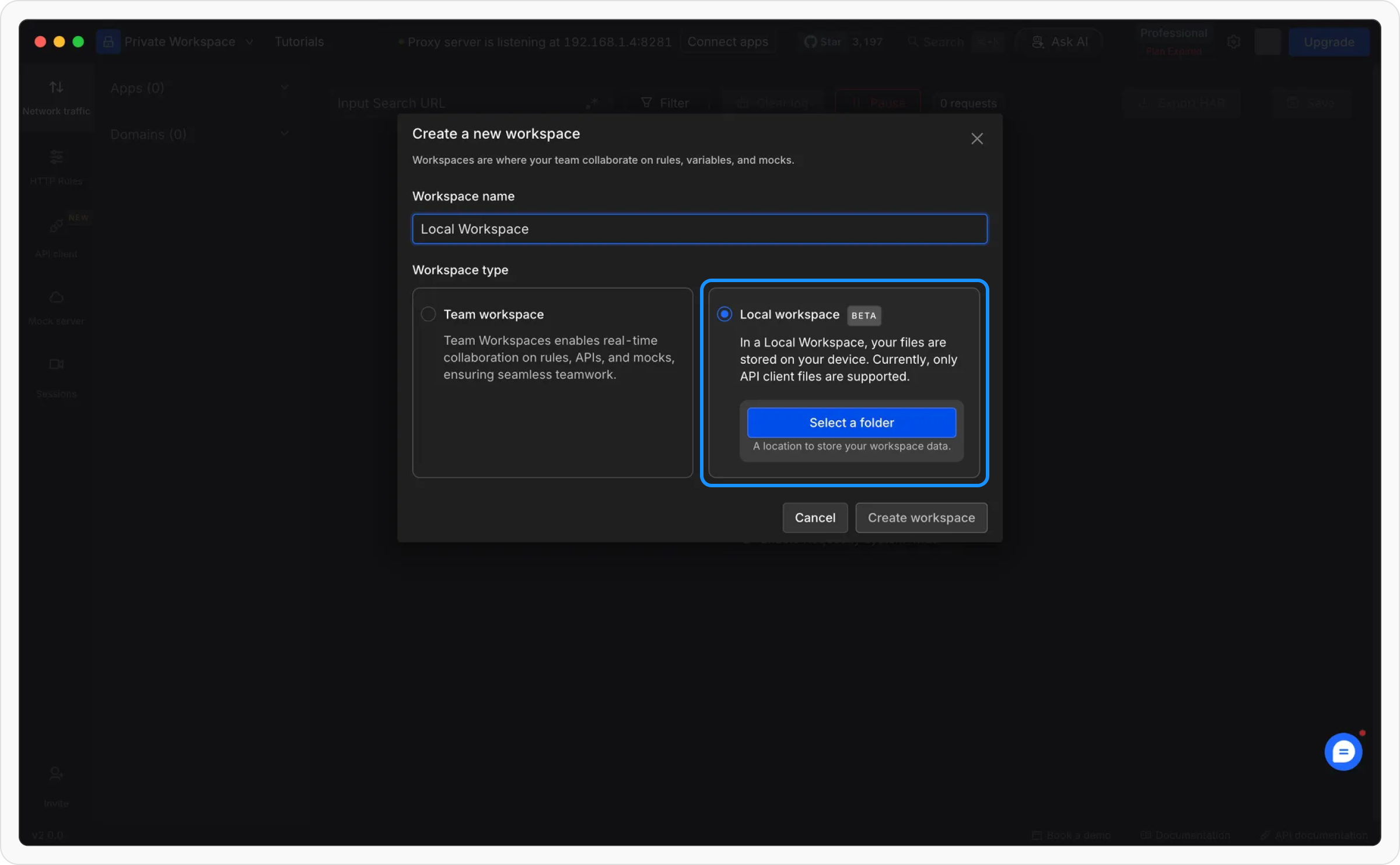 Select “Local Workspace” as the workspace type. Enter a workspace name and choose a folder where all configurations and API data will be stored.